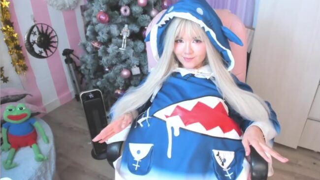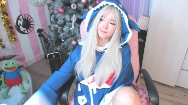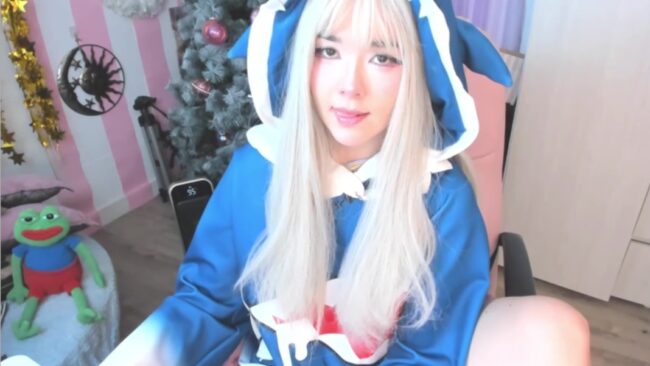 The way that Hell_Fairy includes the spicier details of her cam show, where she is cosplaying as Gawr Gura, is also fantastic, since she lifts up her whole outfit to both give us a sexy treat and show us a tattoo she’s got on her body that’s a mouth encircled by a heart and with the word “brat” written below it, which is a nice surprise to discover on this fantastic stream.