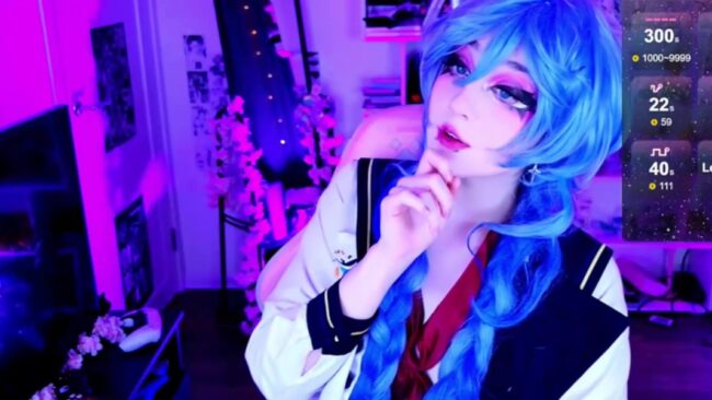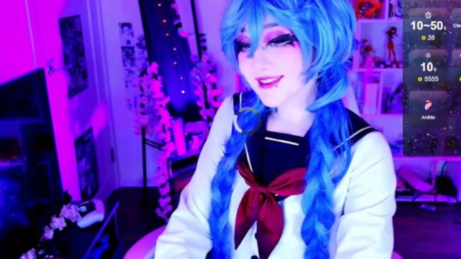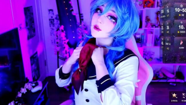 Sometimes she keeps the blouse on, but leaves it open for some sweet flashes of her beautiful physique to be possible; and other times Aki__Ra keeps only her blue braided hair present while all other clothing items take a break, which is a very daring treat that enhances the experience she presents on this kawaii cosplay show.