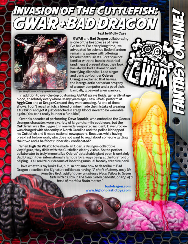 GWAR and Bad Dragon collaborating is one of the best pieces of news I’ve heard. For a very long time, I’ve advocated for science fiction fandom remaining a genre with offerings for adult enthusiasts. For those not familiar with the band’s theatrical (and messy) presentation, their look has always had a dramatic and horrifying alien vibe. Lead singer and band co-founder Oderus Urungus explained that he was the intergalactic barbarian progeny of a super computer and a petri dish. Basically, gross-out alien warriors.