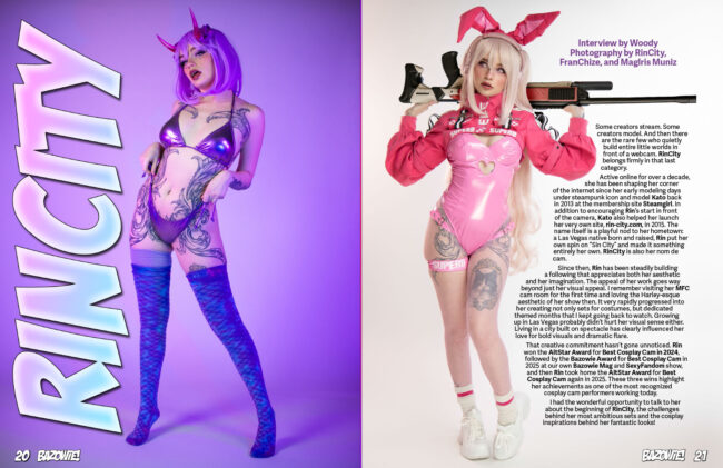 Bazowie #15 features award-winning cosplay content superstar Little Puck looking striking as Greta Gremlin on the cover and inside the pages of our fifteenth issue of Bazowie Magazine in a series of cosplays and interviewed by Peter P. Peter P writes up the romance in Disney’s Andor Season 2. Ryan Phoenix weighs in on Code Violet and My Dress-Up Darling. Woody interviews award-winning cosplay streamer RinCity and we feature some fantastic costumed pinup photos of her.