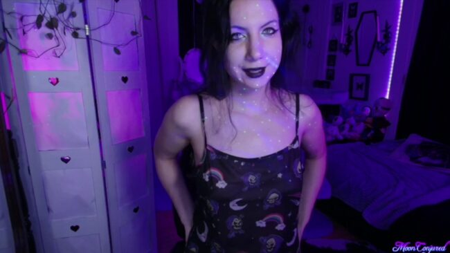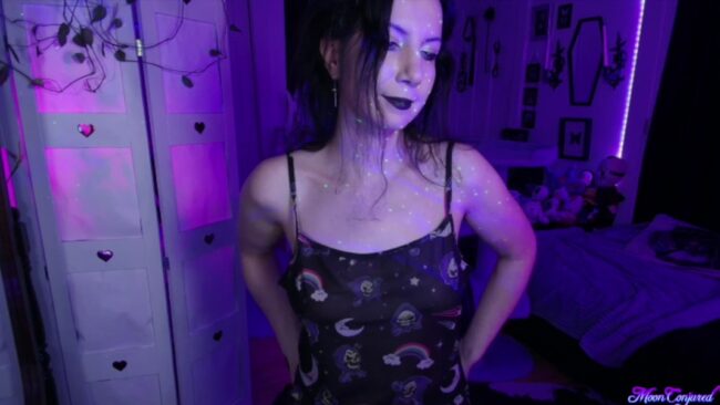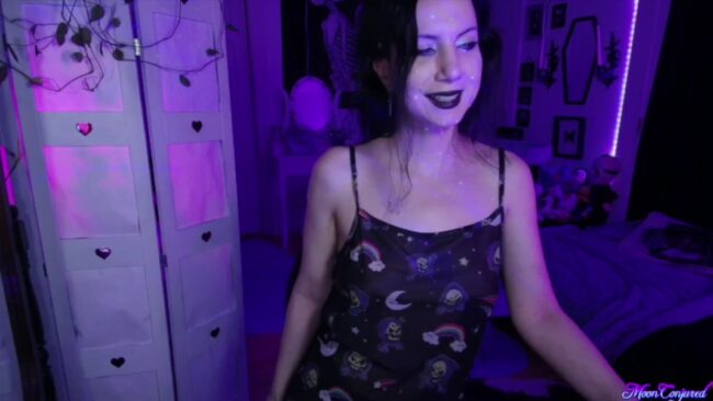 The He-Man theme is totally relevant to this show, given that MoonConjured is wearing a very sexy and awesome Skeletor nighty that also has moons, stars and rainbows to make it even cuter and more whimsical, and I love that we can admire her wearing this slightly sheer piece while she also includes lots of alluring views in her interactions with the room.