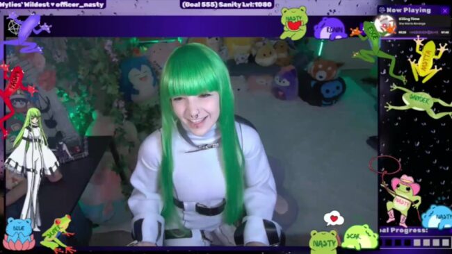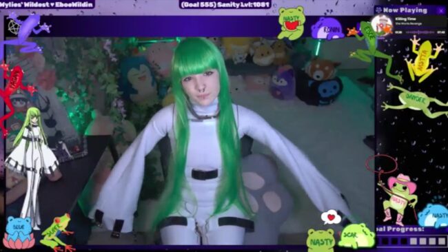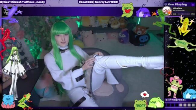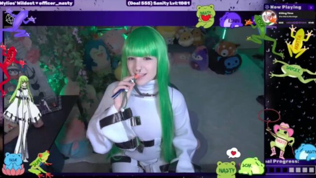 Her poses look great with the playfulness they bring, and I love that her green hair goes well with the leaves in her cam room for a well-balanced visual option that matches the anime feel of her cosplay of C.C. while also letting it stand out in beautiful ways so the dazzling elements can continue delighting us.