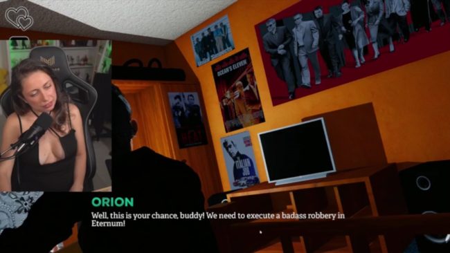 Why does this particular detail capture my attention? Because GamerGirl is playing a specific section in the story where the characters are planning a heist, which is what those movies from the posters are all about.