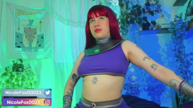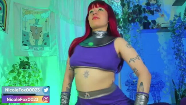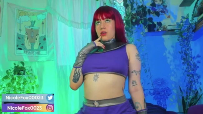 The purple color of the costume combined with the red of her hair is fantastic, and I like that NicoleFox23 wears her outfit in a way that rewards closer observation, given that her clothes hint at some key absences that make the experience of admiring her Starfire cosplay a more exhilarating one.
