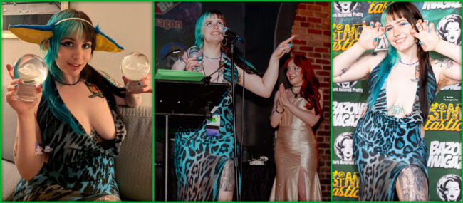 We love our spaceship crystal ball trophies, which express the combination of fantasy and science fiction that we love in fandom. They feature internal and external engraving, so our Bazowie spaceship hovers inside the sphere. We want to see everyone’s photos and videos enjoying the trophies and the festivities in general, so please hashtag #bazowieawards or #bazowie and tag us. You are also welcome to send us photos and video to post.