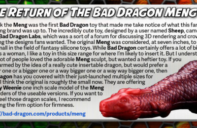 I think the Meng was the first Bad Dragon toy that made me take notice of what this fandom changing brand was up to. The incredibly cute toy, designed by a user named...